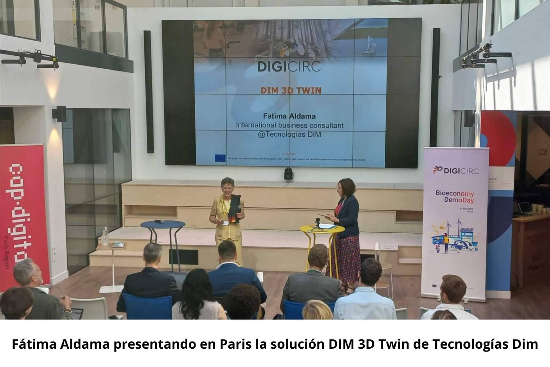 Tecnologías Dim pyme innovadora y empresa de base tecnológica ha presentado con éxito la solución “DIM 3D Twin” en Paris, en la Demoday del evento final del Programa de Aceleración de la Bioeconomía (DigiCirc), donde ha sido premiada con 50.000 € al quedar finalista junto a otras 6 empresas europeas para acceder a la Fase final del Programa Europeo.