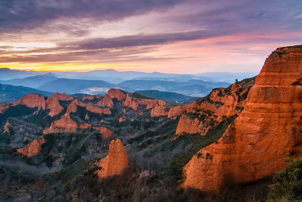 Sin duda, es uno de los parajes más sorprendentes de España, como viajar a otro planeta. Se encuentra en León y es una antigua mina de oro que fue explotada hace miles de años por los romanos. Las excavaciones combinan con el paisaje rojizo de las montañas, junto a grandes extensiones de bosques de castaños. La estampa resulta aún más impresionante bajo el sol del ocaso, cuando los colores se intensifican de una forma realmente mágica.