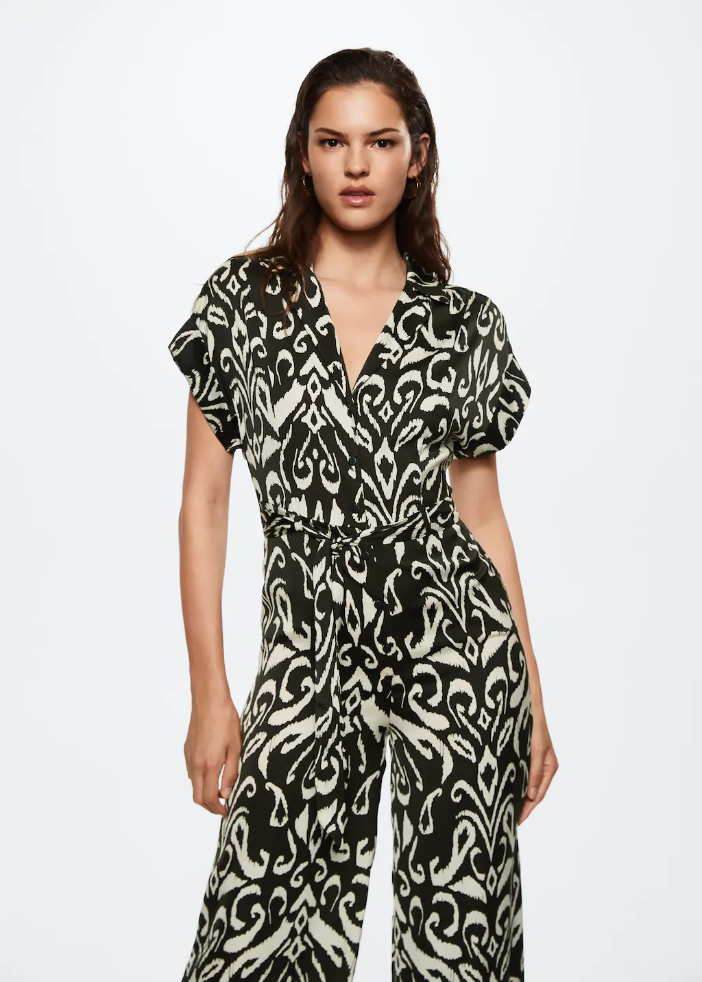 Siguiendo con la lista de los mejores productos de Mango, está el mono cinturón estampado. Según lo señalado por la empresa, esta prenda pertenece a la colección Committed y posee un tejido fluido y diseño estampado. Además, es lardo y recto. Su cuello es camisero y sus mangas son cortas. A diferencia de los anteriores mencionados, posee un cierre delantero con botones. También es parte de la colección de fiestas y ceremonias. Su precio actual es de 39,99 euros.