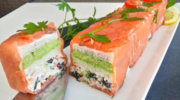 Una vez preparado el pastel de salmón utiliza una fuente para darle la vuelta y servirlo fácilmente. Retira el papel film que previamente has colocado en la base del pastel y comienza a adornarlo. Puedes utilizar los ingredientes que lleva el relleno del pastel como las aceitunas y los palitos de surimi para la presentación. Como ves, sin haber pisado el plató de MasterChef, conquistarás a tus invitados tanto por la vista como por el paladar.