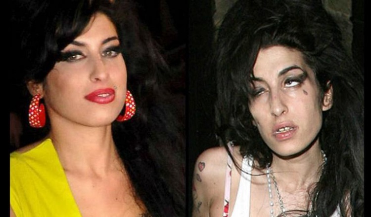 Fue a partir del año 2004 cuando Amy, tras una ruptura sentimental, comienza a tomar pastillas y tiene un cambio de peso drástico debido a la bulimia. Parece que tras una buena época, vuelve a recaer y en drogas más duras, influenciada por su pareja. Fue en el 2007 cuando tuvo que cancelar algunos conciertos y se dijo que había tenido una sobredosis de heroína, cocaína, alcohol y crack. A partir de entonces el declive no para. En el año 2011 fue hallada muerta por lo que se dijo, fue un colapso ante el síndrome de abstinencia. Fue una de las famosas adictas a las drogas con fatal desenlace.