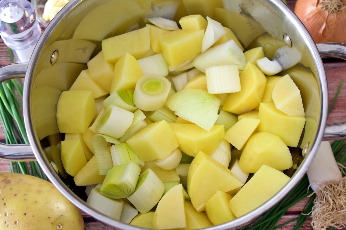 Para preparar nuestra Vichyssoise el primer paso es picar la cebolleta y la parte blanca de los puerros. Limpiamos bien y troceamos todo en rodajas. Ponemos una olla a fuego lento con un poco de mantequilla y salteamos unos minutos, vigilando que la verdura quede blandita pero sin dorarse demasiado. Mientas pelamos las patatas y las chascamos. Es decir, se corta un poco con el cuchillo y se terminan de romper con la mano. Esto se hace así porque facilita que salga el almidón de la patata, y esto le da una textura más cremosa a la sopa. Las añadimos a la olla y salpimentamos.