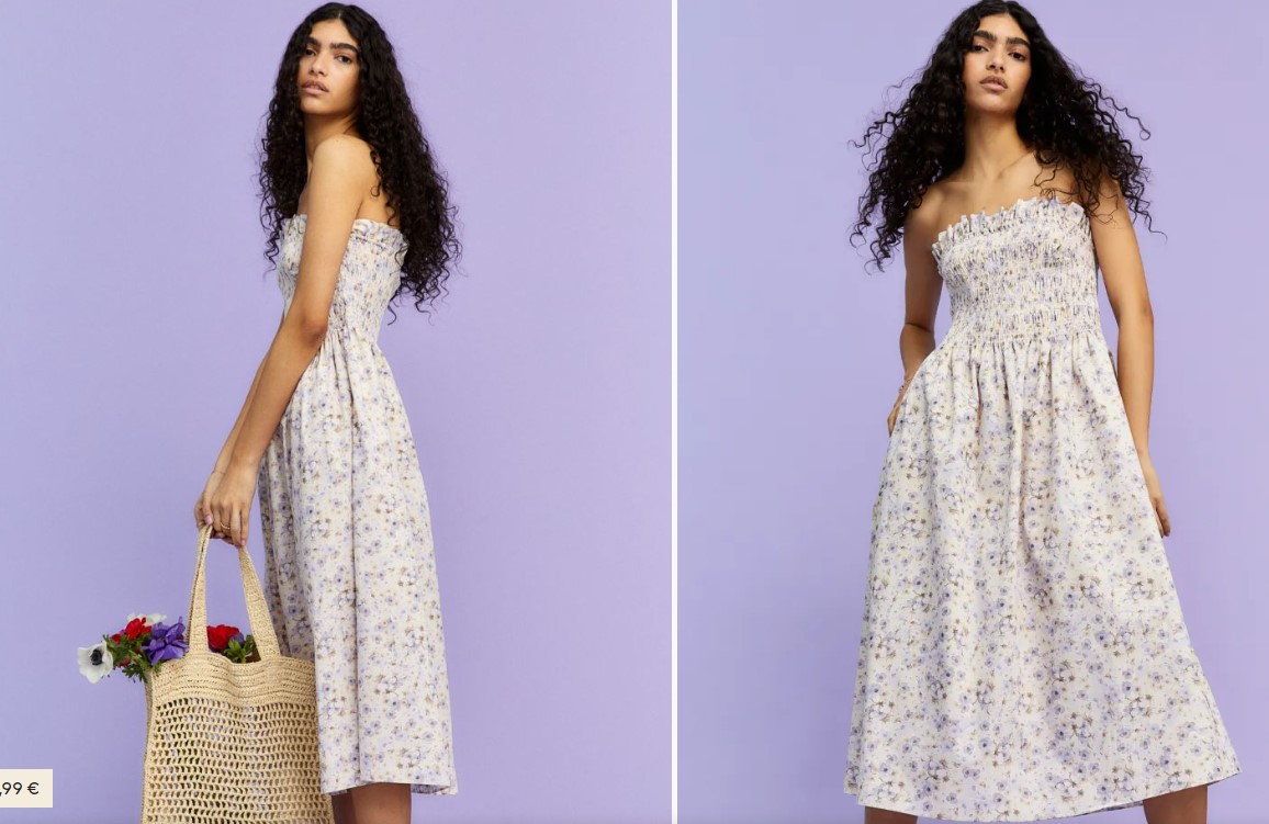 Este vestido de H&M es una opción bonita y elegante, con un corte midi pronunciado por encima de los tobillos, pero por debajo de las rodillas. Cuenta con un fruncido que se ajusta perfectamente a tu cuerpo y a tu silueta de una forma cómoda y favorecedora. Tiene un ribete de volantes en la parte superior y tirantes finos ajustables, por lo que podrás decidir si llevarlo con o sin tirantes en función de tus gustos y comodidad. Está disponible en varios colores, así como estampados, una gran cantidad de posibilidades para todos los gustos y estilos, pero con diferentes precios. Los más caros son el animal print, el rosa y el blanco estampado por 19,99 euros; el color crema con estampado floral puedes encontrarlo a 9,99 euros.