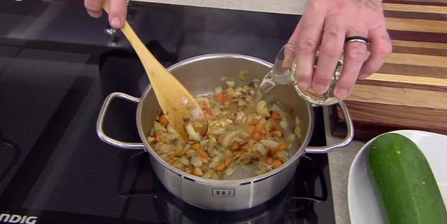 Una vez que añadas la harina y lleves un par de minutos removiendo los ingredientes, deberás verter el vino blanco. Cuando lo hagas, sube el fuego para que la cazuela aumente su temperatura.
