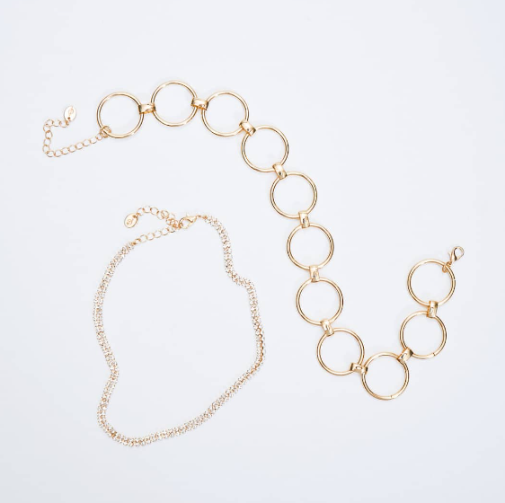 El anterior set de collares no era para todo el mundo, sin embargo, si el anterior modelo no se adecuaba a tus gustos, es muy probable que este set te enamoré. El set 2 choker aros y cristales está disponible en la página web y en las tiendas físicas por el módico precio de 7,99 euros. Un diseño elegante, con dos gargantillas, una con una cadena de grosor medio y cierre para ajustar al cuello, y otro, el choker más llamativo, que tiene una cadena formada por aros y con un cierre ajustable.