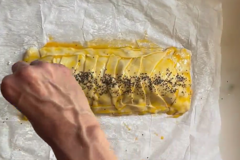 Bate una yema de huevo y con la ayuda de una brocha de cocina pincela todo el hojaldre, este le dará un efecto brillante y muy doradito que será irresistible. Además, espolvorea algunas semillas de chía para terminar de hacerlo perfecto.