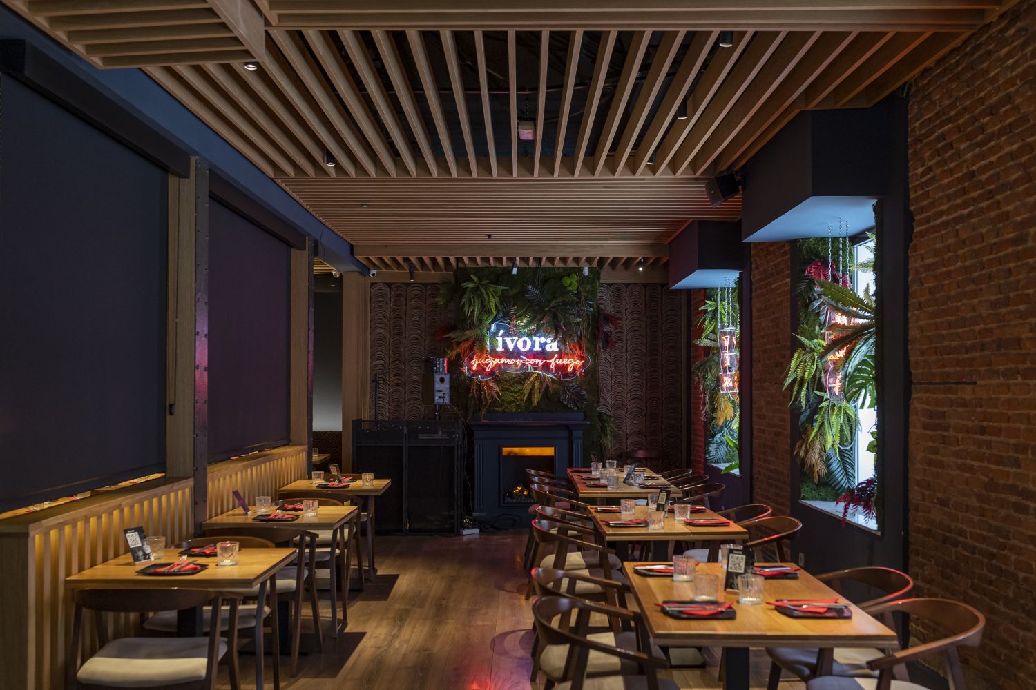 Isabel de la Sierra ha sido la creadora del concepto ívora, la inspiradora de toda la creatividad del proyecto, que además ha diseñado personalmente los elementos insignia del espacio: neones y cubos. El interiorismo del restaurante va en línea con esa identidad, y ha sido ejecutado por el estudio de Isabel Prieto. Los grandes ventanales son escaparates para ser vistos desde la calle, se muestran como si fueran jaulas naturales con elementos vegetales que arropan los neones captando la atención del todo el que pasa por delante. Los textiles y las maderas de techo, evocan a las parrillas de las barbacoas. Ese contraste entre las tapicerías elegantes, ese azul noche petróleo como color base, y el rojo del fuego reflejado en los neones.