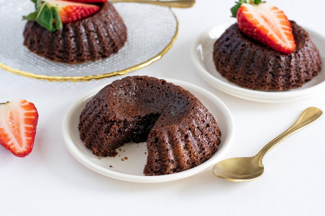 Introducimos la masa del coulant en una manga pastelera para rellenar los envases, aunque también se puede hacer con una cuchara y mucho cuidado. No hay que llenar demasiado el envase, porque el bizcocho crecerá un poco. Más o menos hay que dejar un 1 cm sin rellenar, así evitamos que al subir se desparrame. Una vez tenemos nuestros vasitos con el coulant, llega el momento del horneado, es la parte más importante de la receta. Cada horno es diferente, así que en este punto hay que estar muy pendientes para encontrar el tiempo justo.