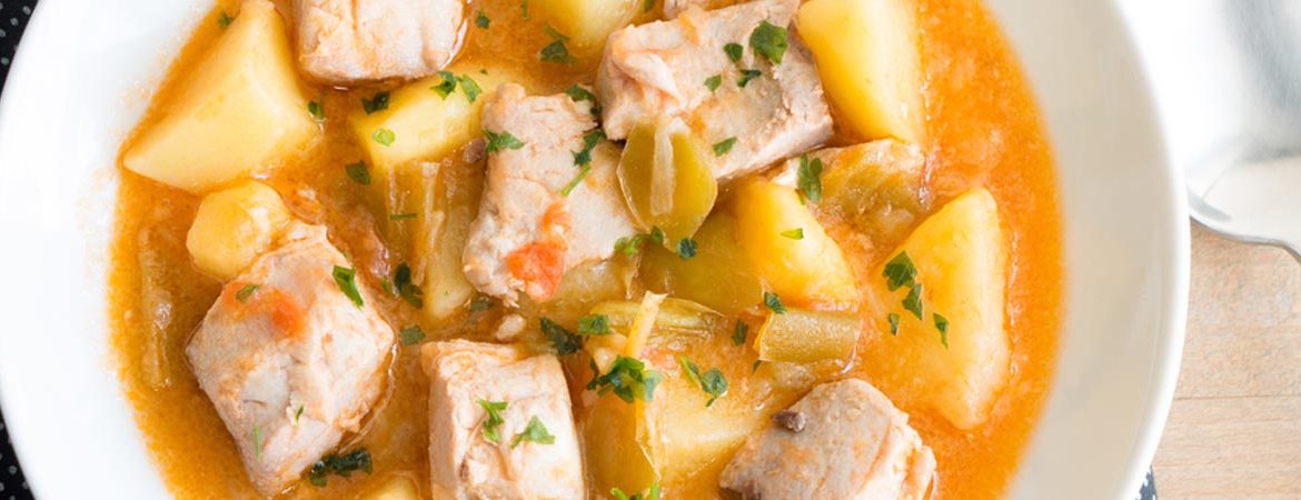 Para preparar el bonito, es necesario quitarle la piel y las espinas (lo cual se puede hacer con antelación, y así usarlas para elaborar el caldo de pescado casero). Acto seguido el bonito se corta en trozos grandes. O, al menos, un poco mayores que los de las patatas. De lo contrario, el pescado se puede deshacer demasiado después, y no queremos eso.