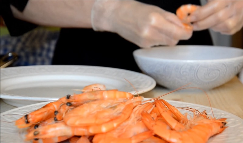 Lo primero para ponerse manos a la obra con esta recete consista en pelar y lavar el marisco, los langostinos. Es importante no tirar las cabezas y las cáscaras, para de esta forma aprovecharlas para preparar un caldo. No tiene ningún misterio, simplemente se cubren con agua y se dejan cociendo en torno a diez o quince minutos.