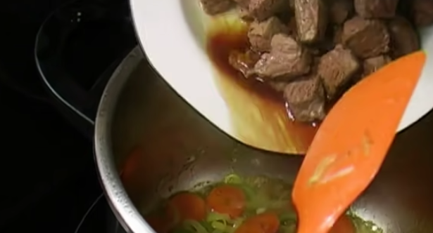 Transcurridos los 10 minutos de cocción de las verduras, estás estarán perfectamente pochadas; por lo tanto, ya puedes añadir los cubos de carne a la olla. Tal como te he mencionado, es sumamente importante que la carne esté perfectamente sellada en este momento.