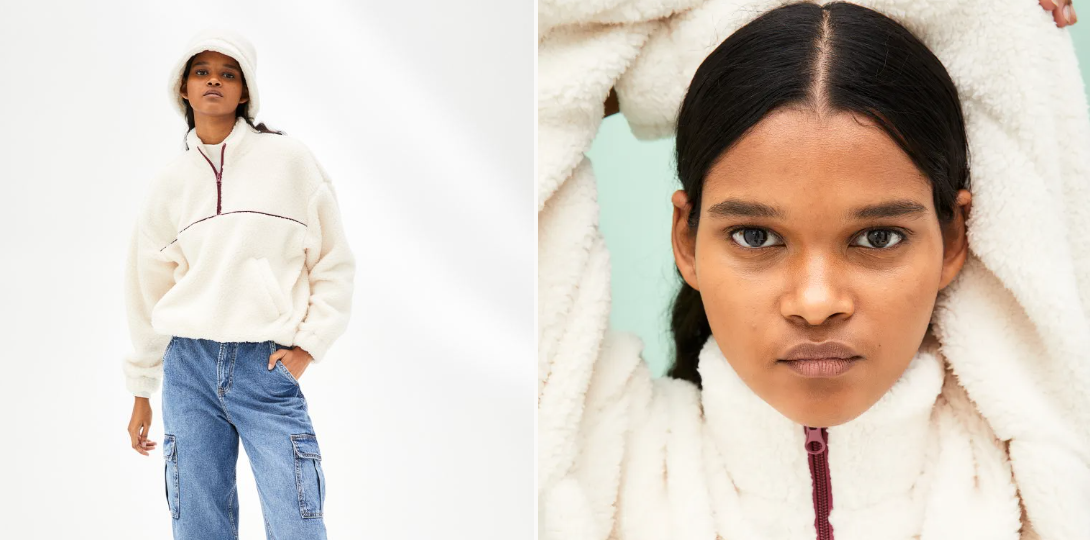 Veamos una prenda menos de vestir y más del día a día, casual, para ir cómoda pero abrigada sin que necesites un abrigo. Las sudaderas están a la orden del día y las usamos para todo, pero esta es diferente, en borreguito con media cremallera y bolsillos insertados al bies. Es un modelo de corte relajado con hombros caídos, cuello elevado con media cremallera y canesú con ribete detrás, elástico revestido en puños y bajo. Su precio es de 24,99 euros. Lo tienes en crema o azul en H&M.