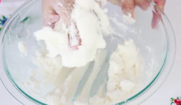 Pon la manteca vegetal en un bol y con tu mano limpia, comienza a amasarla para que con el calor de tu mano se vaya suavizando cada vez más. Incorpora el azúcar y continúa cremando muy bien con tu mano.
