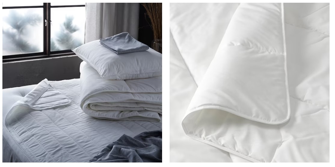 Este edredón de Ikea tiene fibras suaves y ligeras que conservan su volumen y capacidad de aislamiento, permitiendo que tu cuerpo transpire y mantenga una temperatura constante durante toda la noche. Una buena opción si a menudo pasas frío mientras duermes. El edredón se puede lavar a máquina a 60 °C, una temperatura que mata los ácaros del polvo. Está compuesto por un número de hilos de 186. También este producto es utilizable en ambientes públicos, porque el diseño y los materiales están adaptados al uso frecuente. El precio de venta es de 39 euros.