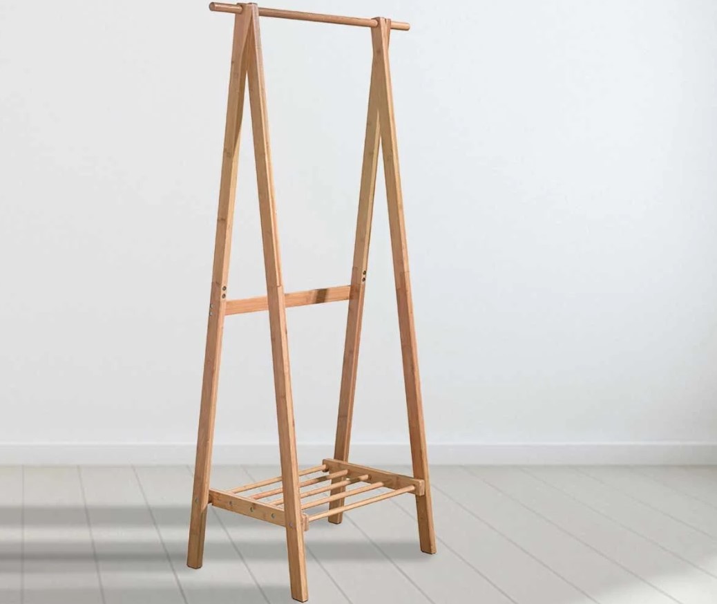 Si nos referimos a muebles para ordenar espacio, no puede faltar en tu dormitorio o la habitación de invitados es esta barra para colgar perchas. Ofrece un amplio espacio para chaquetas, camisas o vestidos. El soporte es espacioso para zapatos o cajas de almacenamiento. Mientras que la construcción es resistente de bambú macizo. Las medidas aproximadas son 41,5 x 147 x 75,5 cm. Tanto la barra como el estante soportan un peso de 5 kg cada uno. El precio de venta es de 29,99 euros.