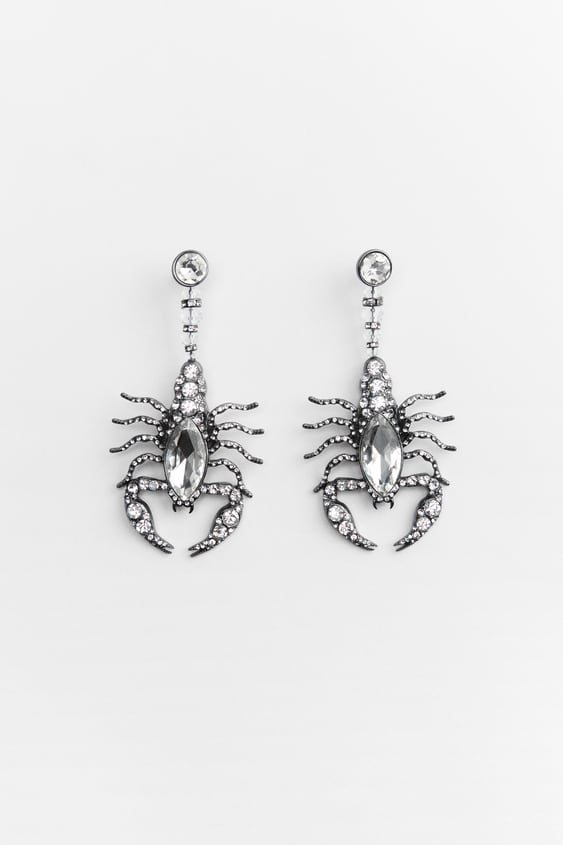 En la nueva colección de Zara también puedes encontrar estos llamativos pendientes con forma de escorpión, a tamaño real y con aplicaciones de brillos. No aptos para personas con fobia a los artrópodos. Son de color gris antracita y tienen un cierre de tuerca. Ideales para completar un look gótico, o para lucir en la noche de Halloween como complemento a un disfraz. La composición es 45% zinc, 40% vidrio, 10% acero y 5% latón, y el par tiene un precio de 15,95 €.
