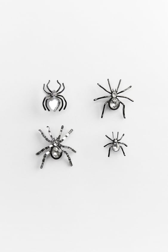 Este pack de cuatro broches es ideal para colocar en tus prendas, o para darle un toque aterrador a tu abrigo en la noche de Halloween. Está compuesto por cuatro piezas de diferentes tamaños y formas con aplicaciones brillantes para darle un aire más sofisticado. Cierran con imperdible o a presión. Están fabricados en 65% zinc, 20% vidrio, 5% hierro, 5% latón y 5% plástico-acrílico, y cada pack cuesta 12,95€.