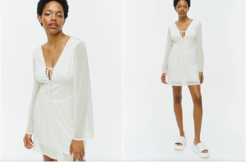 Otro vestido muy apropiado para el buen tiempo es este corto de color blanco. La prenda cuenta con mangas largas acampanadas y un escote de pico pronunciado tanto en la parte de alante como en la de atrás. Presenta unas tiras de anudar en la nuca y una sección ancha con pliegues en la cintura para crear una silueta definida. H&M lo tiene a la venta por 29'99 euros.