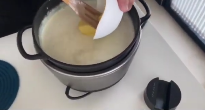 Cuándo lleves unos 50 minutos aproximadamente de añadir leche y de remover constantemente, notarás que ya la leche infusionada está llegando prácticamente a su fin; en este punto, añade el último cucharón de leche.