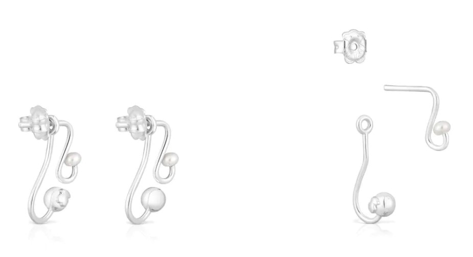 Son unos pendientes de dos piezas de Tous Tsuri de plata de primera ley con perla cultivada en una parte y, en la otra parte, bola de plata con grabado oso de 3 mm. Estos pendientes los puedes usar juntos o por separado. Tamaño perla cultivada: 3-3,5 mm. Tamaño bola plata: 5 mm. Longitud pendiente perla cultivada: 13 mm. Longitud pendiente bola de plata: 22 mm. Cierre presión. Desde la tienda aclaran que solo el pendiente de perlas cultivadas tiene perno. Cuestan 65 euros.