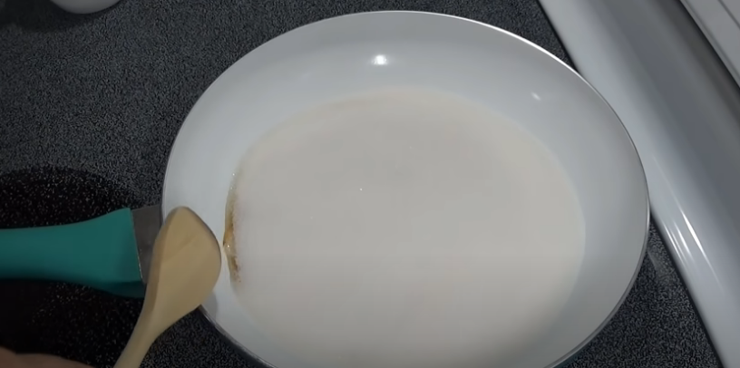 Deja la sartén al fuego sin tocar ni remover hasta que notes que en uno de los bordes comienza a mostrarse el azúcar derretido.