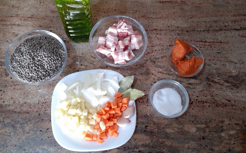 Para realizar este estupendo guiso de lentejas, necesitas 350 gramos de esta legumbre. Si no las compras cocidas, te recomendamos que adquieras la variedad pardina. Otros ingredientes que vamos a emplear en la receta son 200 gramos de panceta, dos dientes de ajo, una cebolla, una zanahoria, una patata, laurel, aceite de oliva y sal. También está el sustituto del chorizo...