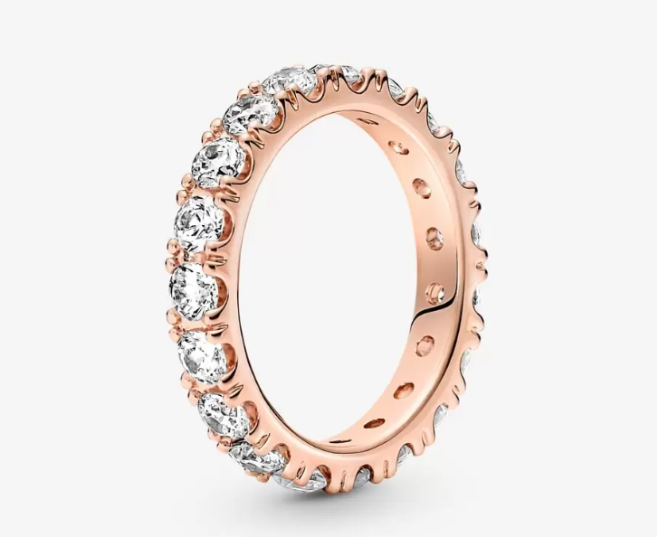Cuando hablamos de las novedades de Pandora, no podemos dejar de mencionar el Anillo Eternity. Posiblemente, es uno de los más elegidos a la hora de hacer un regalo, por ser sumamente bello y por costar tan solo 99 euros. Es el modelo Eternity Brillante en oro brillante, oro rosa o plata de ley. Cuenta con un acabado a mano con una aleación única de metales con un recubrimiento electrolítico de oro rosa de segunda ley de 14K.