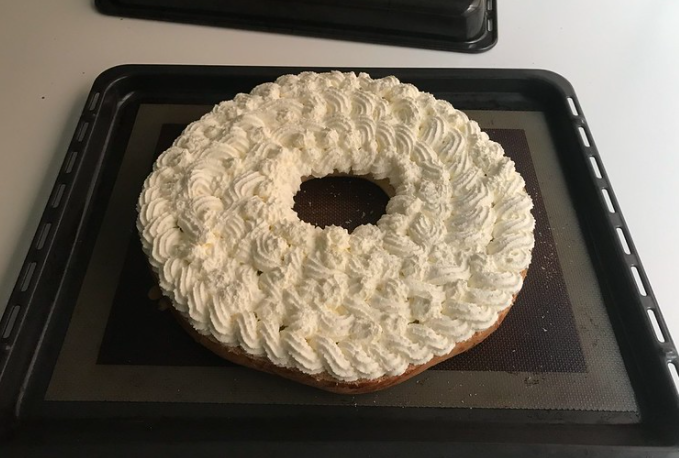 Coloca la crema pastelera en una manga, corta la corona de manera horizontal de forma que queden dos mitades iguales y con la manga rellena de crema pastelera, procede a rellenar el interior de la corona.