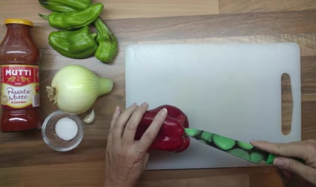 Una vez que el aceite tome temperatura, añade el diente de ajo picado finamente para que vaya aromatizando el aceite e incorpora también los pimientos, los cuales deben ser los primeros en añadirse para que se vayan pochando y resulten tiernos.