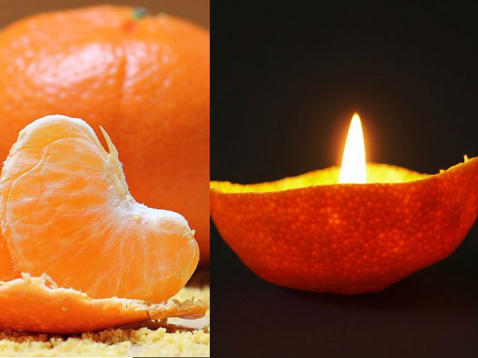 Cuando peles la naranja o la mandarina, ten mucho cuidado de no dañar la zona de la cáscara en la que se encuentra un piquito que se verá en la parte interna de la misma y esto va a hacer la función de la mecha, lo que debes hacer es colocarle unas gotas de aceite esencial del que más te guste, con unas gotas de aceite vegetal, o simplemente en mejor aceite de oliva, así como pinchar la cáscara con clavos de olor y enciéndela.