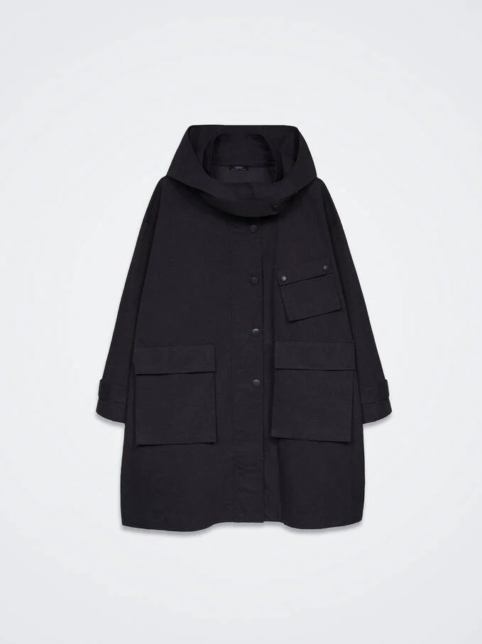 En Parfois también nos ofrece este versátil abrigo con un diseño estilo parka, muy ponible y práctico para el día a día, tanto para usar en la ciudad como para usar en paseos campestres. Es ideal para los días de lluvia, ya que cuenta con una amplia capucha y un confortable cuello alto. Cierra en la parte delantera con cremallera y botones y tiene tres bolsillos delanteros. Está hecho en poliéster y algodón y es de color negro. Su precio es de 49,99€.