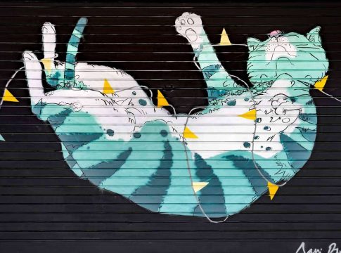 El artista que firma el mural está actualmente trabajando en una serie artística dónde aparecen diversos animales cayendo en torsión, enredados en guirnaldas en forma de banderolas de fiesta mayor. En esta ocasión y, para adaptarse al formato de la puerta del parking de Núñez i Navarro, el artista ha representado dos gatos sobre un fondo negro – uno de ellos solamente con medio cuerpo. “La torsión, aunque sigue los parámetros de anatomía del animal, es exagerada y evidencia una complexión más larga de lo habitual, para darle más dinamismo a la obra”, explica Buch.