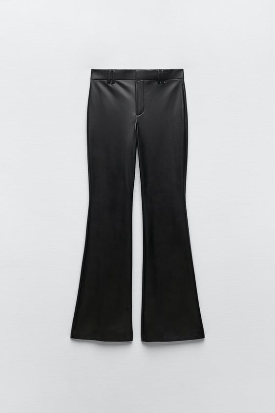 Los pantalones efecto piel son una de las tendencias más importantes de la temporada, y Zara ahora nos ofrece uno de sus diseños más originales a un precio mucho más bajo. Son de tiro alto con trabillas en la cintura y falsos bolsillos en la parte de atrás. Cierra delante con botón interior, gancho metálico y cremallera, y tienen un diseño con el bajo acabado en flare para un toque mucho más original. Tienen un 43% de descuento y ahora cuestan 12,99€.