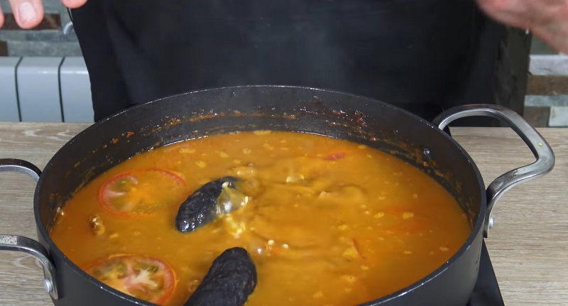 Para que el conjunto rompa a hervir antes, viértele el agua caliente. Corta un tomate en rodajas y pónselas en la superficie. También le tienes que añadir unos trozos de morcilla que le van a dar sabor. Precalienta el horno a máxima temperatura con calor arriba y abajo. En lo que se va calentando, el arroz se va a ir cociendo. Tienes que hacerlo en un recipiente que sea apto para este electrodoméstico.