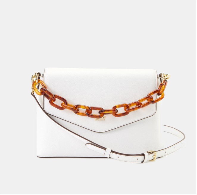 Damos comienzo a esta lista de magníficos productos que tienes con descuentazos por el Black Friday con un precioso bolso de hombro de la firma DKNY. Este se presenta en color blanco con solapa y una cadena decorativa a contraste.