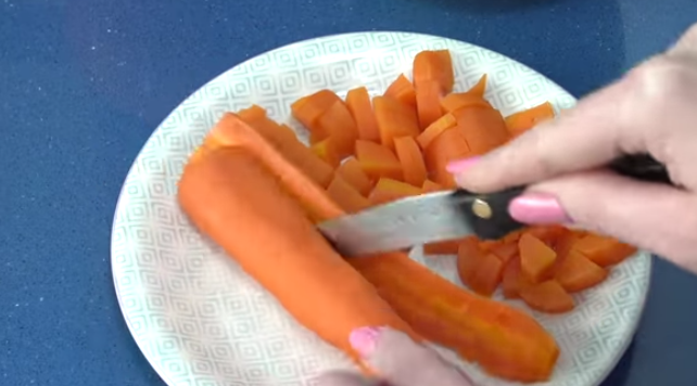Una vez que tengas listos los huevos, patatas y zanahorias, procede a pelar cada uno de ellos y córtalos en pequeños cubos. Puedes, si así lo deseas, reservar un huevo para añadirlo rallado al final como decoración.