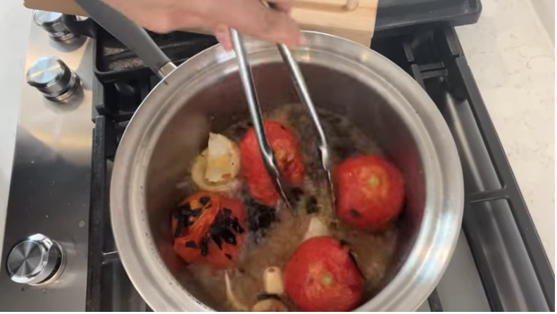 Cuando retires las tortillas fritas y crujientes de la cazuela, pon de regreso la cazuela en el fuego y espera que tome nuevamente temperatura. Cuando esté caliente, pon los tomates enteros a freír y añade también la cebolla pelada.