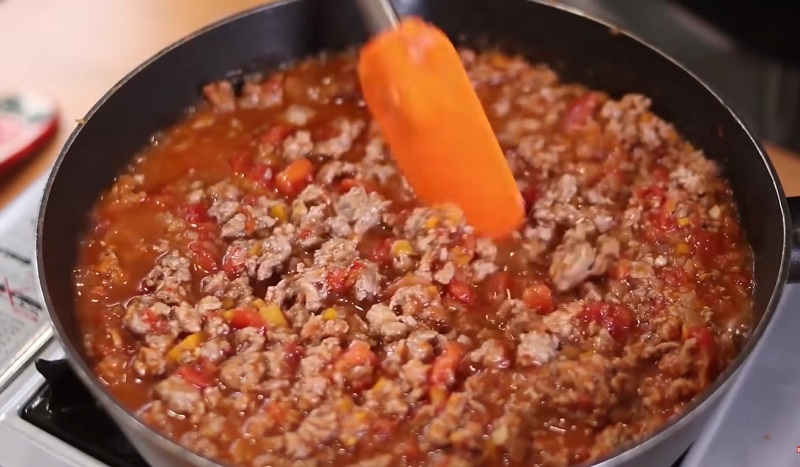 Para que el tomate no se seque antes de tiempo, vierte en el sofrito un vaso de agua. De esta manera, vas a controlar que cuando se evapore el líquido, ya estará listo el relleno de la lasaña. Remuévelo todo para que se reparta por todo el conjunto. La carne te va a quedar muy jugosa y no se va a secar. Antes de retirarlo, quítale la hoja de laurel y pruébalo para corregir el punto de sal. Ahora llega el turno de la bechamel...