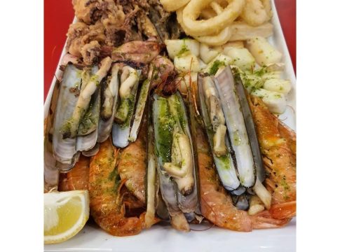 Sepia a la plancha, calamares a la romana, chipirones a la plancha, conos de calamar rebozados, gambas a la plancha, pescaditos fritos y navajas conforman la bandeja más solicitada del restaurante. Esta opción puede servirse acompañada de tapas y ensaladas, buñuelos de bacalao, una pata de pulpo que todo comensal debería probar y solomillo afeira elaboración propia.