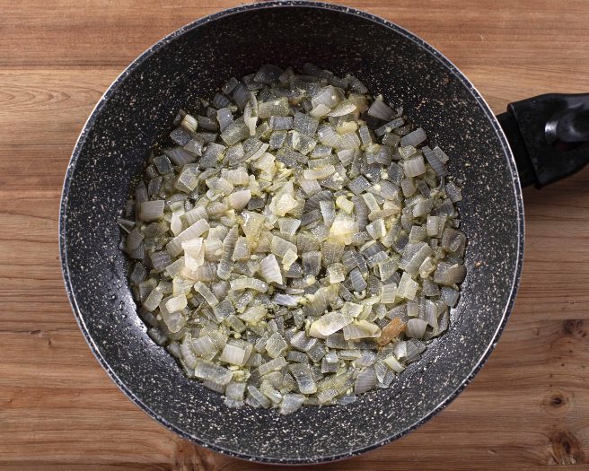 Luego añadir los dientes de ajo finamente picados a la olla y comenzar a cocinarlos con las setas, es el momento de incorporar también las patatas previamente cocidas y también las cebollas sofritas.
