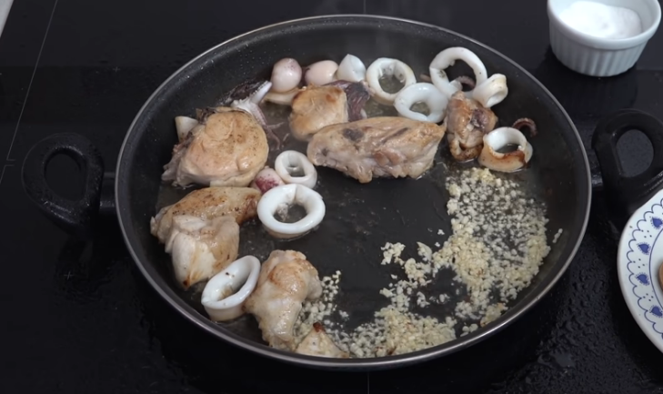 Al terminar de incorporar estos ingredientes, será el momento de añadir los que llenarán de sabor y color a la paella mixta. Para comenzar, aparta un poco los calamares y el pollo y pon a freír en un lado de la cazuela los dientes de ajo previamente pelados y picados finamente.