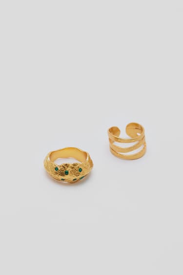 Los gruesos anillos dorados están arrasando como tendencia en joyería. Se valora que sean bien llamativos y estos de Pull & Bear lo son. Se venden en un pack de 2 unidades de diferente diseño. Uno de ellos tiene circonitas de color verde incrustadas y el otro está compuesto por tres hilos, a modo de anillo triple. Ambos son de latón, recubiertos de oro de 24 k. Hay dos tallas, la S de 17mm y 16mm y la M de 17mm y 18,5mm. Se recomienda no mojar ni poner en contacto con productos cosméticos. El pack tiene un precio de 35,99€.