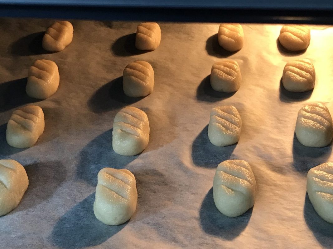 Cuando tengas listos los mazapanes en la bandeja y los tengas perfectamente decorados con las nueces y los piñones y también los tengas pintados con la yema de huevo batida con agua, será el momento de llevarlos al horno.
