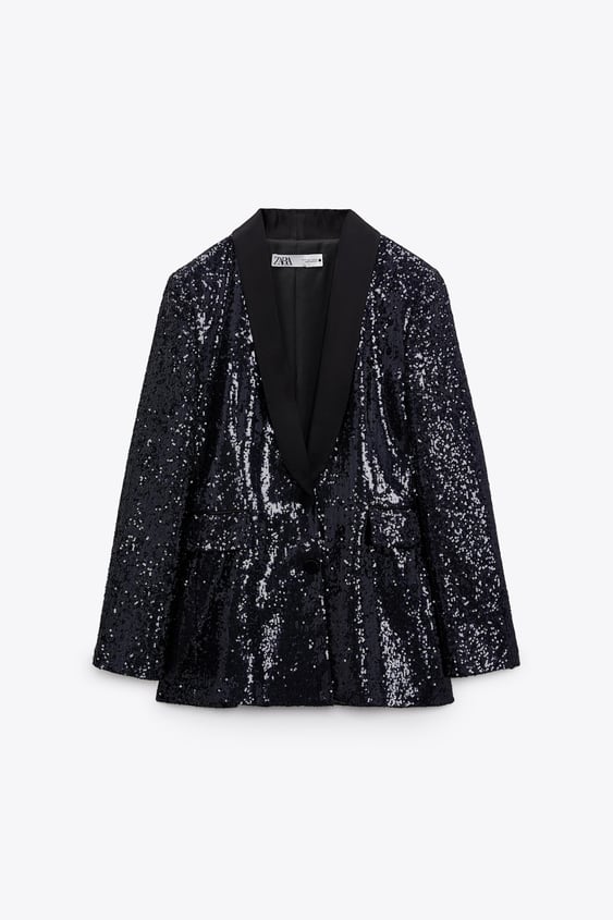 Otra blazer muy de fiesta disponible en el catálogo de Zara es esta pieza con cuello tipo esmoquin y manga larga. Tiene bolsillos con solapa en la parte delantera y aplicación de lentejuelas por todo el tejido excepto en las solapas. Lleva un forro interior a tono y cierra delante con botones forrados con el mismo tejido. Una prenda diseñada para hacerte brillar que forma parte de una edición limitada. Es de color marino y tiene un precio de 79,95€.