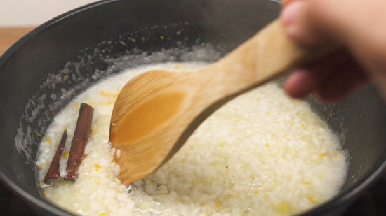 Cuando retires la rama de canela y las cáscaras de los cítricos, continúa con la cocción del arroz con leche al estilo de Arguiñano durante unos 15 minutos y recuerda, durante este tiempo, remover constantemente para que el arroz libere su almidón y así obtengas un postre más cremoso y delicioso.