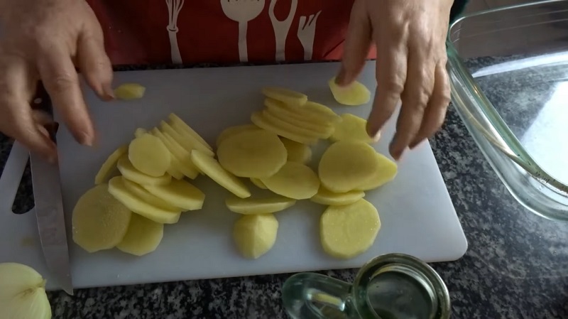 Para acompañar a las chuletas de cordero, vamos a realizar una guarnición muy sencilla de patatas y cebolla. Para ello, tienes que quitarles la piel a los dos tubérculos, ya sea con un pelapatatas o con un cuchillo. Después, córtalas en rodajas muy finas. Si las dejas muy gordas, van a tardar más tiempo en hacerse en el horno o van a quedarse crudas.