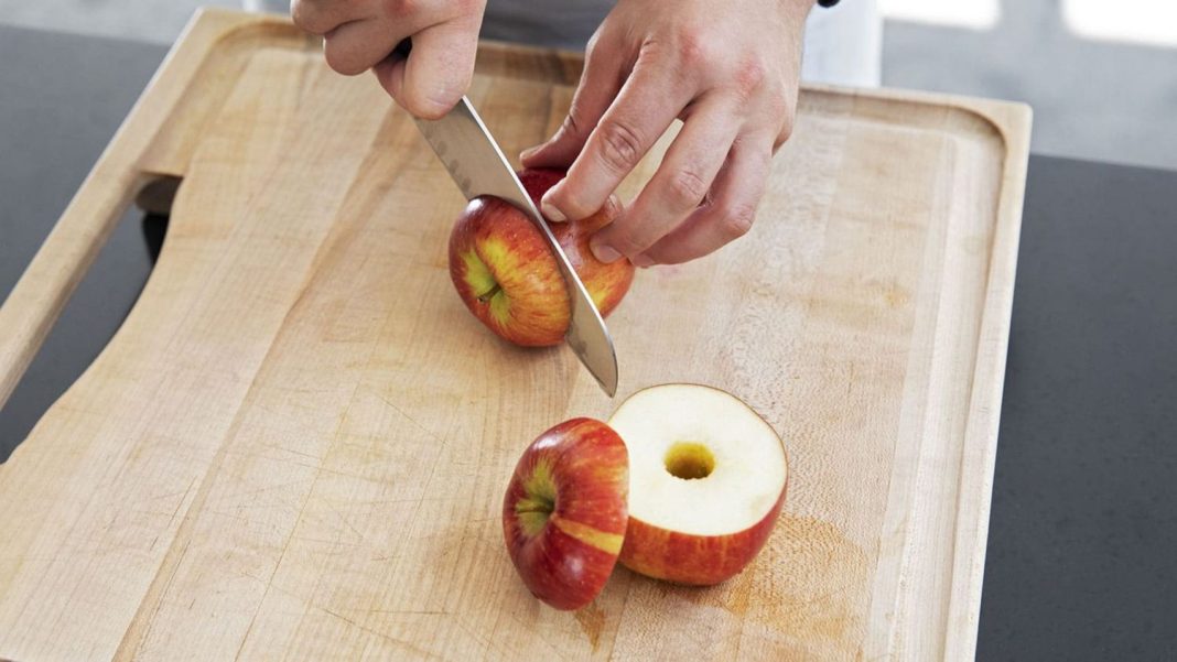 Para preparar las manzanas para rellenar los pastelitos, comienza retirándoles toda la piel; una vez que las tengas peladas, córtales la parte de abajo y también la superior y luego córtalas a la mitad, retira el corazón y déjalas completamente limpias.