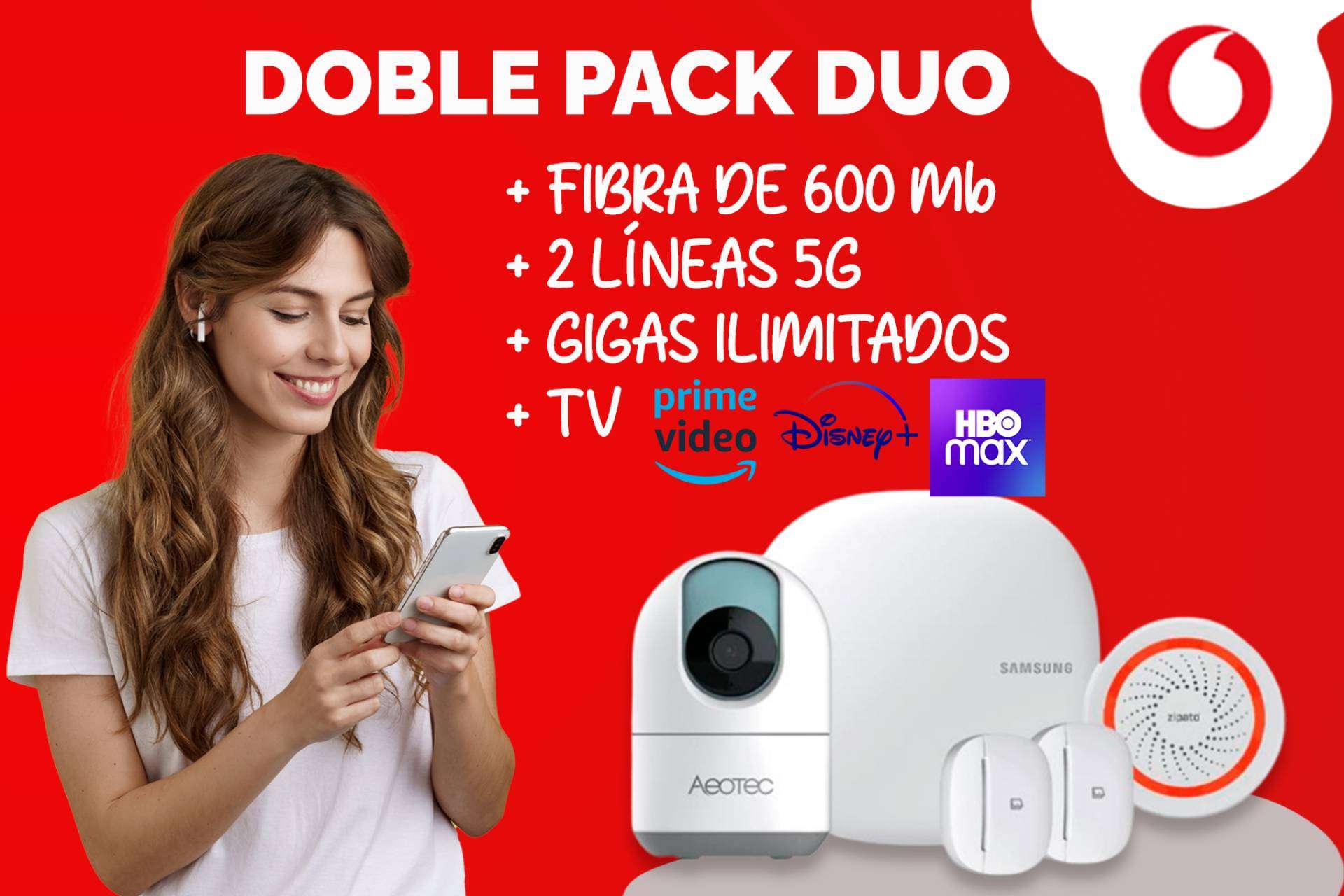 La promoción incluye dos líneas 5G con datos y minutos ilimitados, además de un pack de TV a elegir que puede incluir HBO Max o Disney + con Amazon Prime, junto con más de 60 canales. Todo ello, por un coste de 70 €/mes, con permanencia de 12 meses.