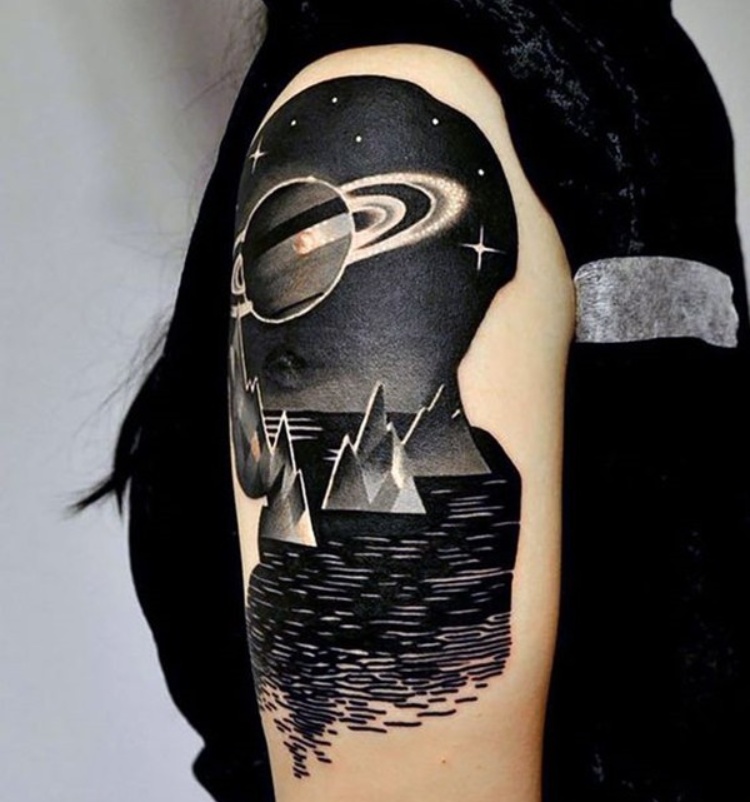 Es un tatuaje bastante curioso cuanto menos, ¿No crees? El mar, la luna, la galaxia, los glaciares..., un tatuaje ideal para un auténtico amante de la noche, del negro y de los astros. Eso sí, este tatuaje ha tenido que ser duro ya que meterte tanta tinta negra en el cuerpo de golpe no tiene que ser demasiado agradable.