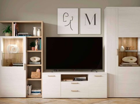 Hay quienes buscan un mueble de salón para almacenar objetos, es decir, un modelo que destaque por su gran funcionalidad. Para ellos, el modelo Vinicius, de 234 cm y por un precio de 199 € (sin descuento asciende a 286 €), es perfecto. Este modelo combina el diseño minimalista con la calidez del color sonoma y del blanco, que siempre es una buena elección. Sus estructuras alternas permiten incorporar diferentes elementos, en caso de que se quiera colocar mucha decoración, o dejar con pocos detalles para seguir la misma línea minimalista.
